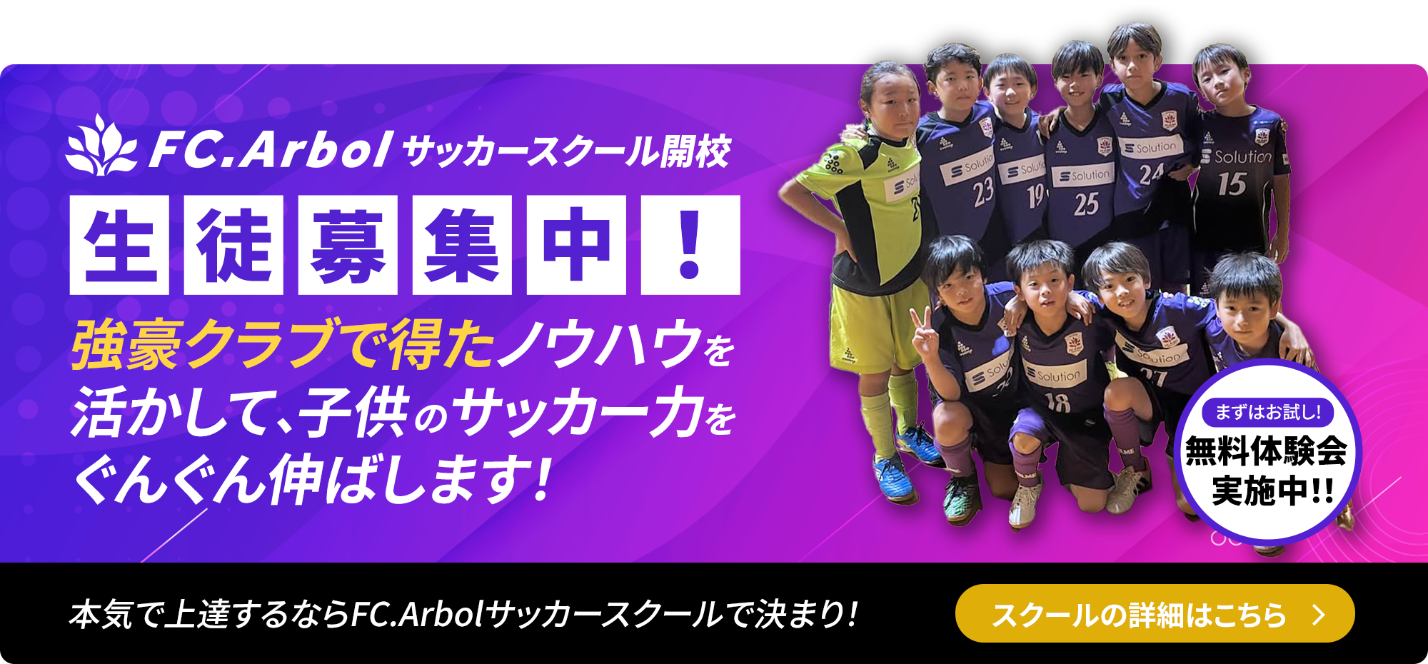 FC.Arbolは、「勝利」を目指すと同時に、選手一人ひとりの個性を大切にし、「人」としての成長を重視した育成を行っています。サッカーという枠を超え、将来あらゆる分野で活躍できる人材を育てることが、私たちの使命です。指導スタッフは、県内強豪クラブでの豊富な指導経験を持ち、Jリーグ下部組織や有力ジュニアユースチームへの輩出実績も多数。育成と成果の両立を大切にし、志ある仲間たちと共に、全国トップクラスのチームを目指して日々挑戦を続けています。